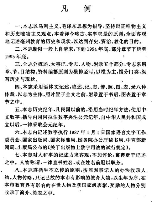 亳州《教育志》详尽地记载了该地区教育历史沿革、学制变迁、重要教育机构、著名师长、学生及教育成效等信息,内容涵盖基础教育、中等教育、职业教育、现代高等学府的建立与发展等,是一部系统反映亳州地方教育历程的编年体志书。其地域特指现今安徽省亳州市及周边区域,据实记录了当地教育机制的演变与文化贡献。