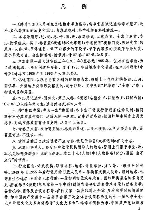 《蚌埠市志》断限一般为清宣统三年(1911年)至1985年,有些事物适当上溯或下延。记述范围以现行行政区划的蚌埠市为准,原则上不包括所辖怀远、五河、固镇县。