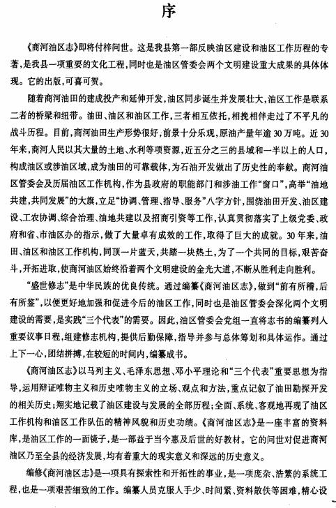 全书约38万字,采用大16开本全彩色印刷,收录照片100余幅,时间跨度从20世纪50年代石油勘探起始,一直延续至2002年。在结构上,该书由卷首彩页、概述、大事记、专志各编及附录组成,核心内容共分为8编、36章、116节。书中系统记述了商河油田的勘探开发历程、油气集输与电力等基础设施建设,并重点着墨于地方特有的“油区工作机构”演变、油地工农关系协调,以及“油区综合治理”和“油区治电”等专项工作,全面还原了油区秩序维护与资源管理的复杂过程。