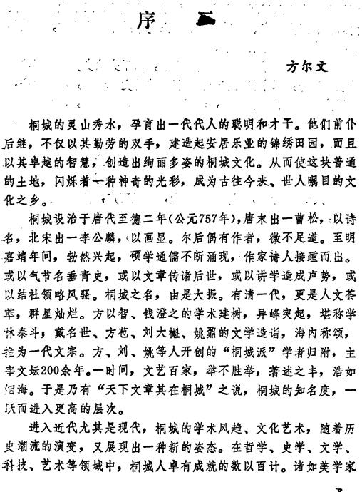 《桐城文化志》是由方尔文、汪福来主修的地方志类著作,1992年12月由安徽人民出版社出版。全书系统梳理安徽省桐城市文化事业发展脉络,涵盖公元757年(桐城建制时)至1988年的文化沿革,重点记录文化行政机构沿革、群众文化、戏剧电影、报刊图书等基础领域。该书共设九章,包含《文化行政机构沿革》《群众文化》《戏剧 电影》《报刊 图书》《文艺创作》《桐城文派》《文化名人》《艺文选存》及附录,通过文献考证与大事记相结合的方式,分类整理地面文物遗存、馆藏文物及历代文化名人传记。附录部分记载桐城自901年至1988年的文化发展轨迹,包含重要事件如唐末"五老榜"进士选录。