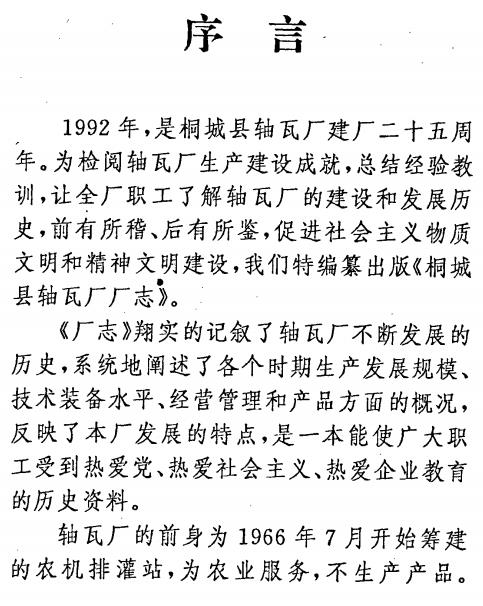 本志记述了安徽省桐城县轴瓦厂生产建设、企业管理等各方面发展的历史与现状。