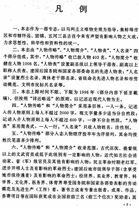 本志收录了蚌埠市境内的著名人物,包括人物传略、人物简介、人物表和人名录等部分。
